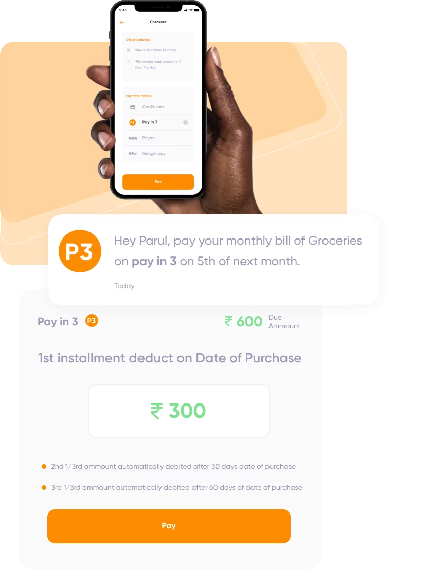 Let your users pay only 1/3rd and complete the purchase while the remaining get’s debited 30 & 60 days later in 2 parts via UPI @ Zero Interest!